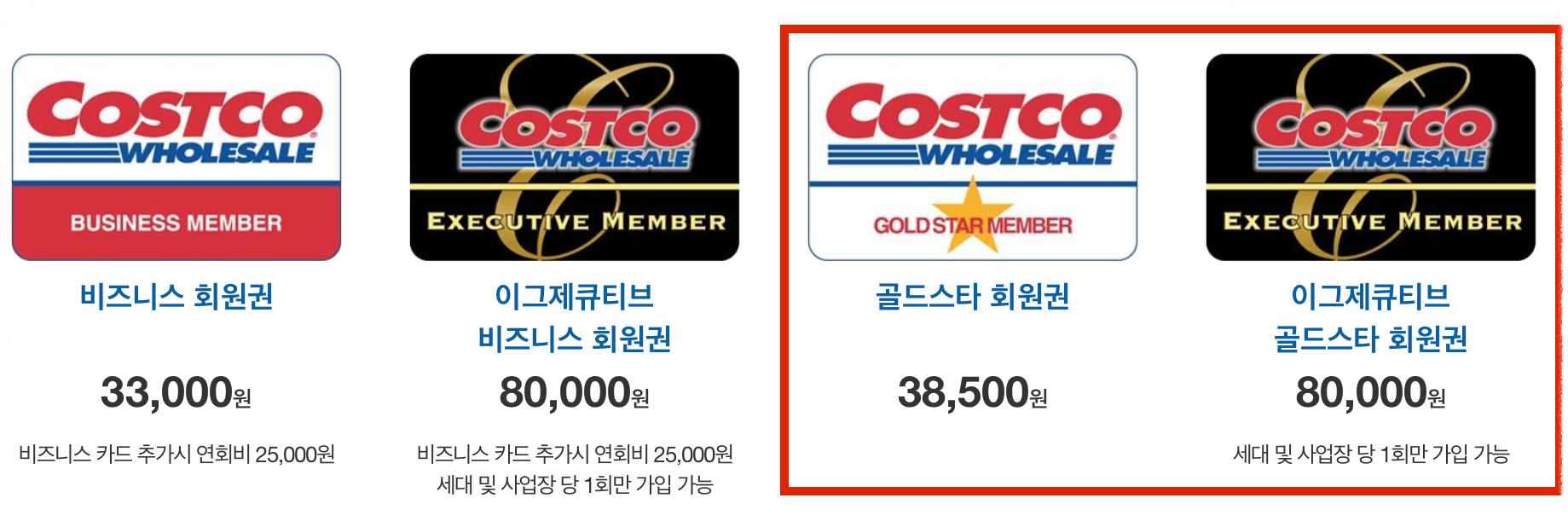 먼저 코스트코 홈페이지에서 안내하고 있는 회원권은 아래 사진과 같습니다.