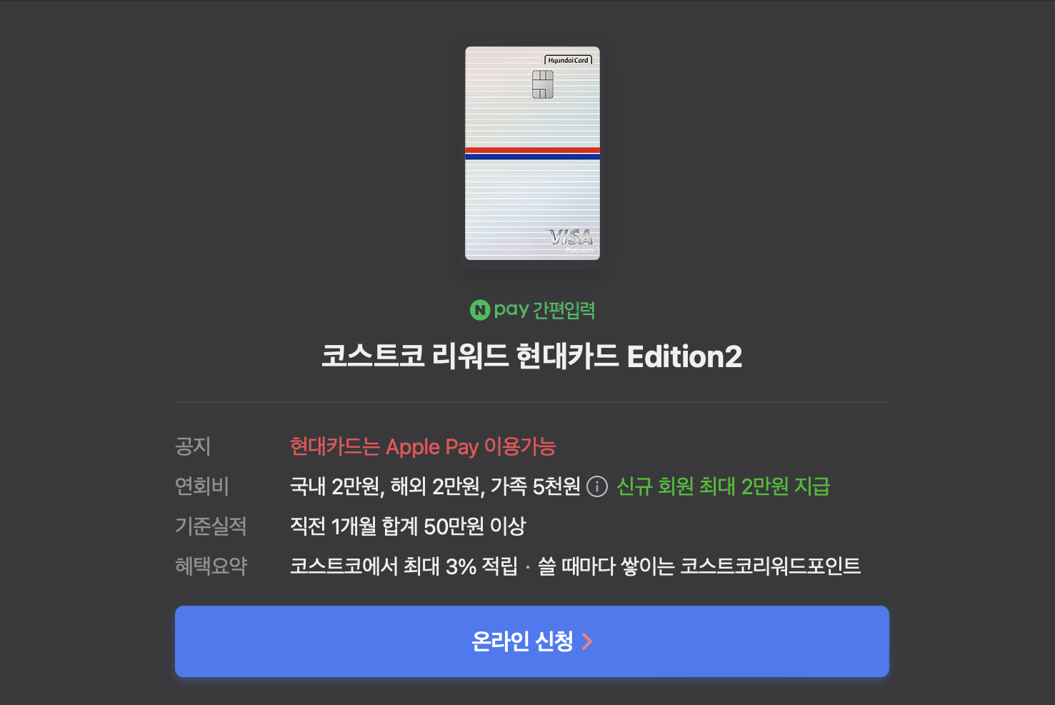 해당 카드의 혜택 요약에 코스트코에서 최대 3% 적립이 가능하다 적혀있습니다. 다만 상세조건 확인한 결과 온라인몰의 경우 3%, 코스트코 매장은 2% 적립이며 연회비 2만 원에 매월 50만 원 이상의 이용금액이 있어야 한다는 적립 조건이 있습니다.